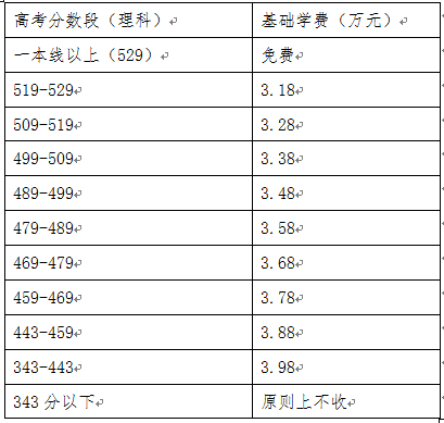 收費標準:基礎學費(按下表)+保障學費(與二本分數(shù)線分差*1000元)。