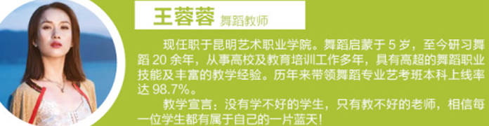 現任職于昆明藝術職業學院,舞蹈啟蒙于5歲至今,研習20余年,從事高校及教育培訓工作多年,具有高超的舞蹈職業技能及豐富的教學經驗,歷年來帶領舞蹈專業藝考班本科上線率達98.7%。