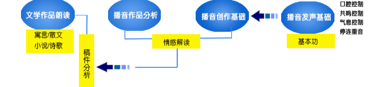 播音與主持發(fā)聲學(xué)基礎(chǔ)、播音創(chuàng)作基礎(chǔ)、文學(xué)作品朗讀、新聞稿件播讀、播音作品分析、辯論技巧、即興評述、節(jié)目主持藝術(shù)等。
