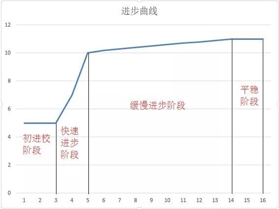 一開始的成績很不理想,對應圖中的初進校段;之后在一個比較短的期間,大約兩個月左右的時間,我的成績得到比較大的提升,對應圖中的快速進步階段;接著是一個緩慢進步的階段;最后成績趨于穩定。