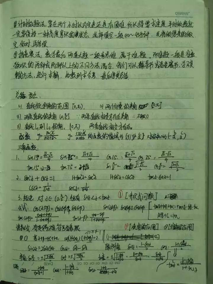 舉個例子。比如三角函數,如果遇到非特殊角的三角函數值,我們是在做題的時候再用誘導公式,半角,倍角公式推導嗎?當然是平時就給總結好。還有一些常用的公式,就算背部下來,留一個印象,知道怎么去推導的,也可以加快做題的速度,如下圖總結的一些三角函數和一些相關的公式,都是平時先推導好,考試直接用。