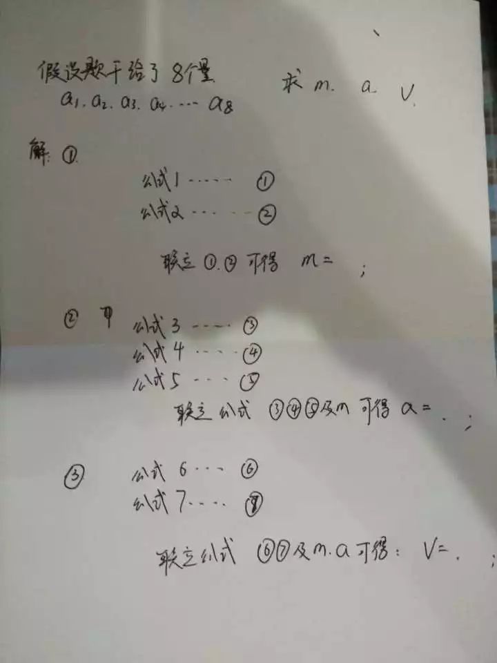 有一次模擬考試中,我做到最后一道物理大題的時候只有3分鐘就要交卷了,可是這個題有20分啊,后來我就想著,公式能得分,我就把該題用到的公式寫上了,我花了3分鐘得了14分,我記得那個題有3個小問,每個小問求一個量,但是我現在不記得當時具體要求什么,所以在這里我假設第一問求m,第二問求a,第三問求v。那我是怎么3分鐘拿到14分的呢,就是中間過程全部用變量代替,直到最后才解出來。如下圖: