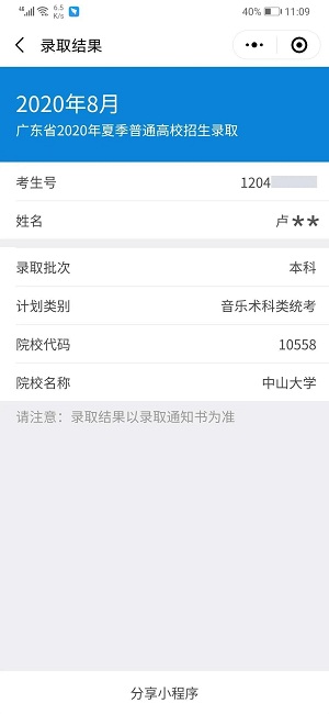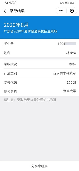 五、熱烈祝賀我校藝術生文化課全員上本科,其中盧俊瑋(音樂類)文化課471分,音樂類總分562,全省排名53。