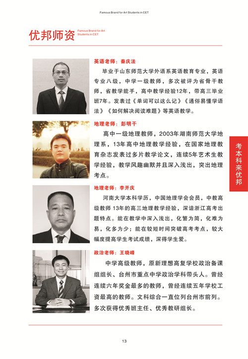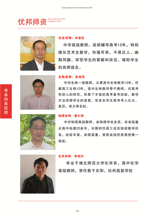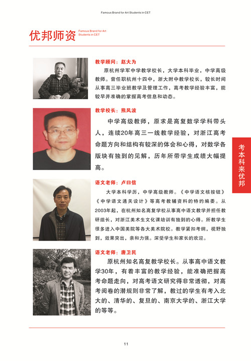 2014年我們在次攜手求是教育,打造藝術生文化課領域最強師資,特聘學軍中學原校長趙大為先生為我書院教學顧問,原杭州新理想高復校長郭玉祿擔任優邦書院校長,并得到杭州各名校高考專家的鼎力支持,我們的教學與高考信息同步。針對藝術生的高考文化課我們首創導師制教學模式,教練式手把手輔導,真正做到因材施教,讓每一位來優邦書院的學生圓自己的大學夢。